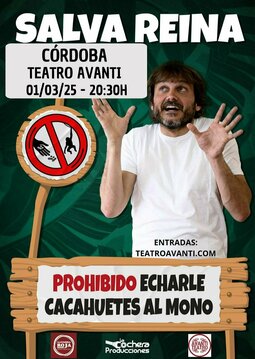 El humorista Salva Reina presenta su espectáculo 'Prohibido echarle cacahuetes al mono', en el que habla de la actualidad, de situaciones cotidianas llevadas al extremo e improvisa con el público. Un espectáculo de humor apto para toda la familia, basado en la fórmula de la stand up comedy; lo que pasa es que Salva no tiene ni idea de inglés.